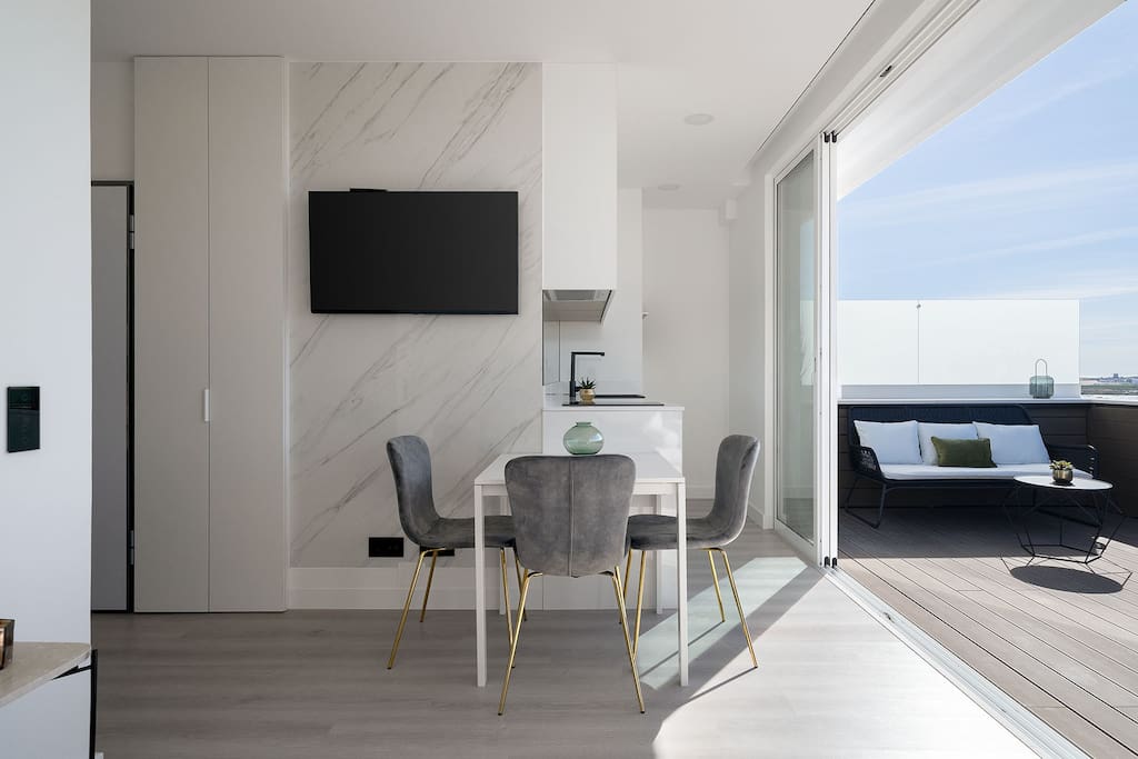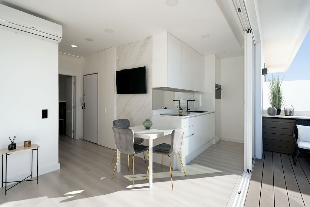 Part of the ‘FantaseaHomes’ rentals collection! • Stunning views of the sea and Ria Formosa National Park • Private terrace / first row sunset 🌅 • Walking distance to buses, trains, and attractions Renovated tiny 1-Bedroom apartment with retro-modern decor and a private terrace offering stunning views of the sea and Ria Formosa National and city. Fully equipped w/ kitchen, cozy living area, modern bathroom. Perfect for relaxing or exploring, with everything you need for a comfortable stay