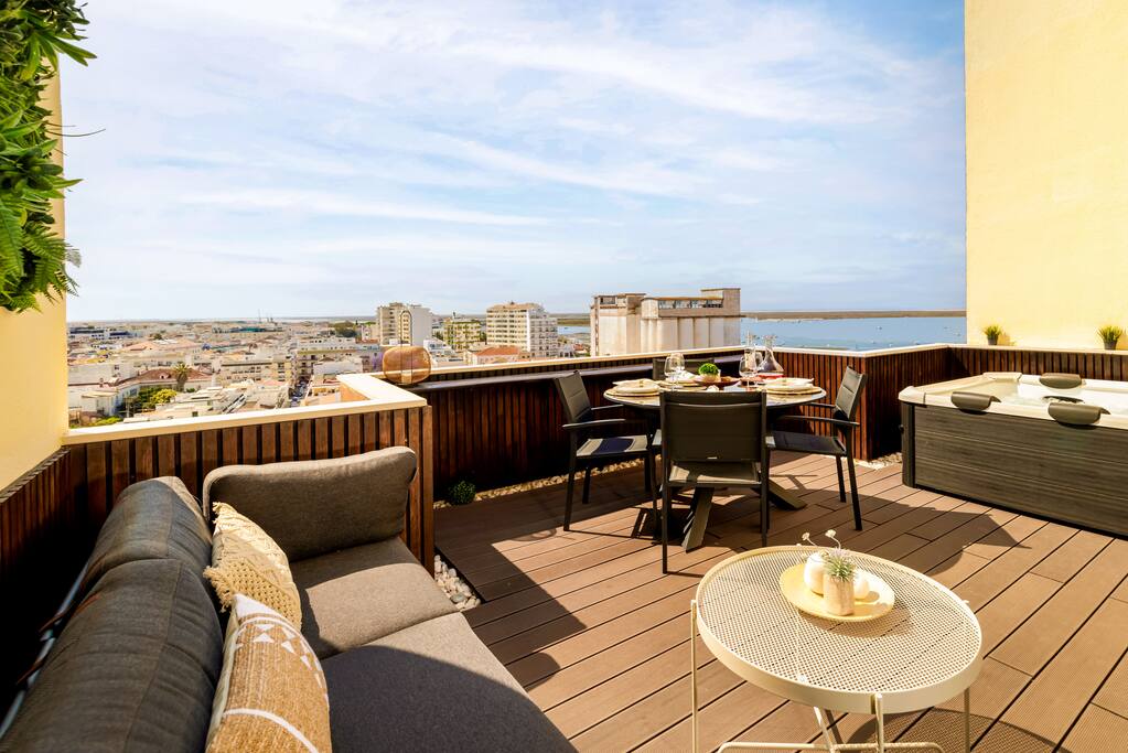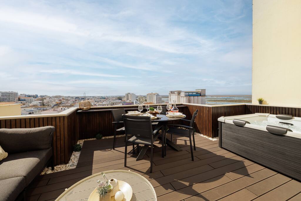 Welcome to your dreamy escape in the heart of Faro! This 2-bedroom apartment blends retro-modern charm with unbeatable comfort and jaw-dropping views over the city, sea, and the stunning Ria Formosa Natural Park. Located just 5 minutes on foot from Faro's historic downtown and accessible by lift, this sunlit retreat is ideal for couples, families, or friends looking to unwind in style. The spacious private terrace is perfect for lazy breakfasts or evening drinks, complete with an outdoor dining area and a luxurious hot tub—your own private oasis with panoramic sunset views. Inside, you'll find: - A fully equipped kitchen for all your culinary needs - Cozy living room with smart TV and serene lighting - Two stylish bedrooms: one with a queen-size bed and the other with two single beds - A modern bathroom with a clean, bright design - Air conditioning and high-speed Wi-Fi You're only a 10-minute drive from Faro Airport and just steps away from public transportation, restaurants, and attractions. Whether you're here to explore the Algarve or simply relax, this apartment offers the perfect base with all the comforts of home. Part of the ‘FantaseaHomes’ collection